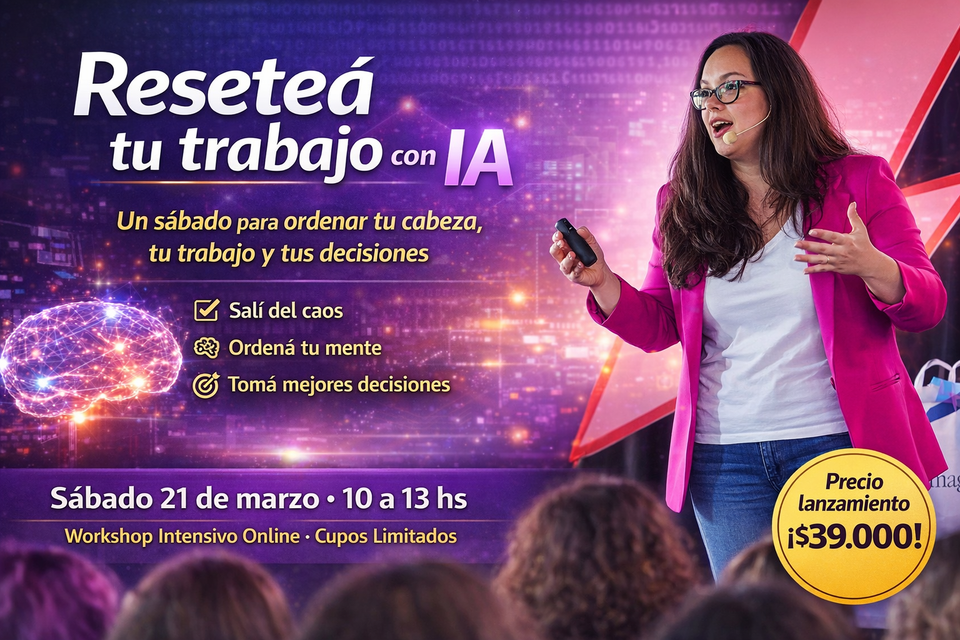 Reseteá tu trabajo con IA es un workshop intensivo de 3 horas pensado para personas que se sienten desordenadas, saturadas y con la sensación constante de que necesitan un cambio, pero no saben por dónde empezar.